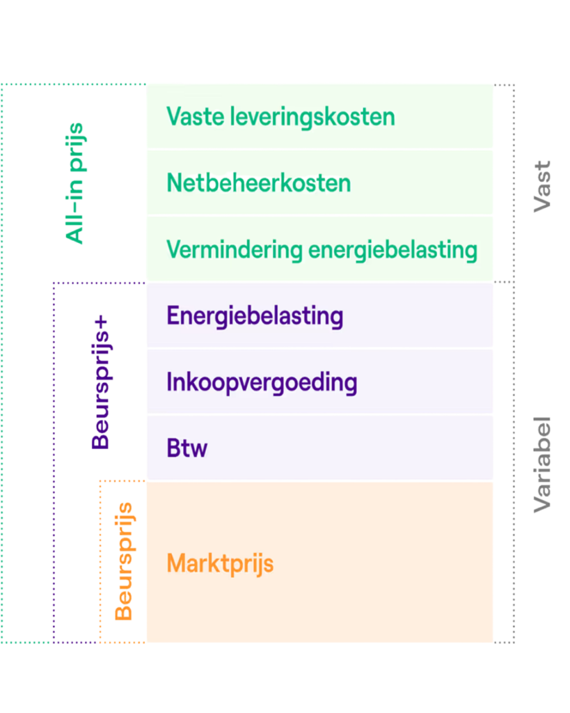 Hierbij een overzicht van de totstandkoming van de prijs voor zowel stroom als gas. De prijs is opgebouwd uit variabele en vaste kosten. Het verdienmodel van leveranciers zit in de vaste leveringskosten en uiteraard de inkoopvergoeding.